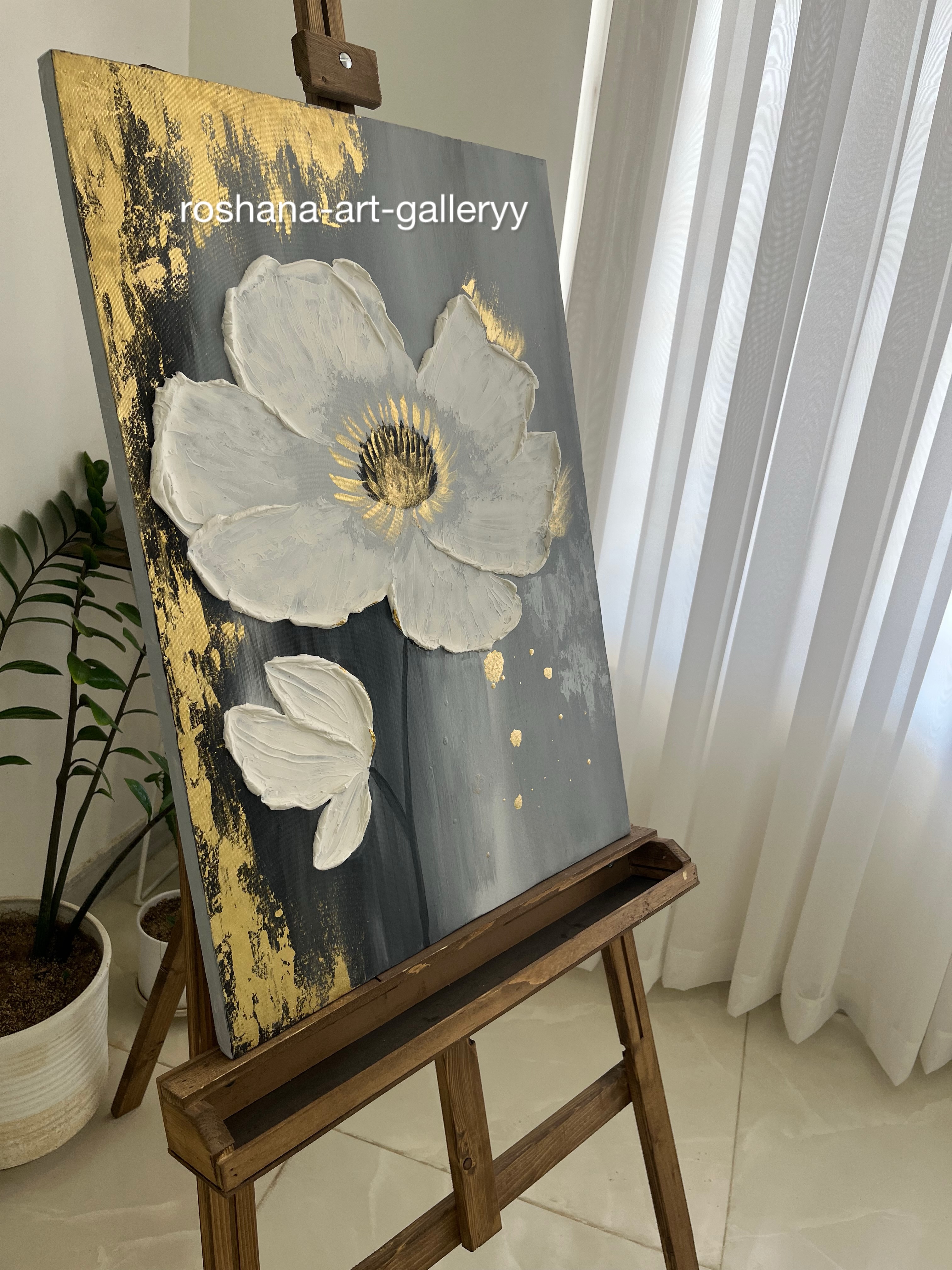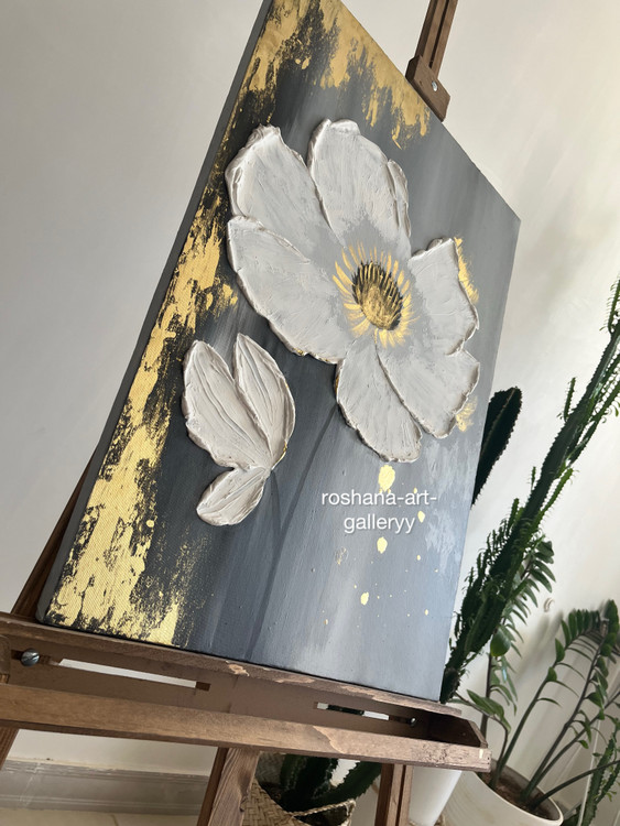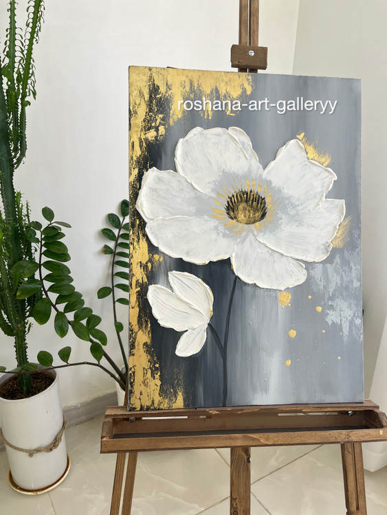 تابلو گل سفید ساده و در عین حال زمینه کار شده آن ،گرمای مناسبی به فضای منزل شما میبخشد .